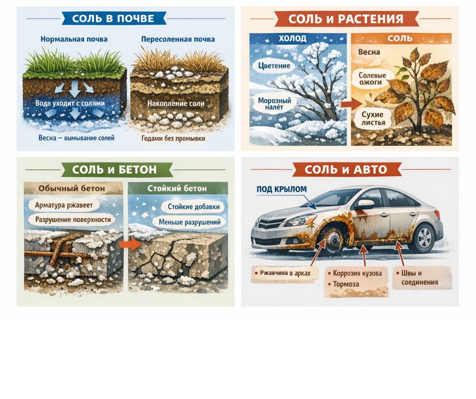 Соль, бетон, трава и металл: честный разговор о зимних реагентах